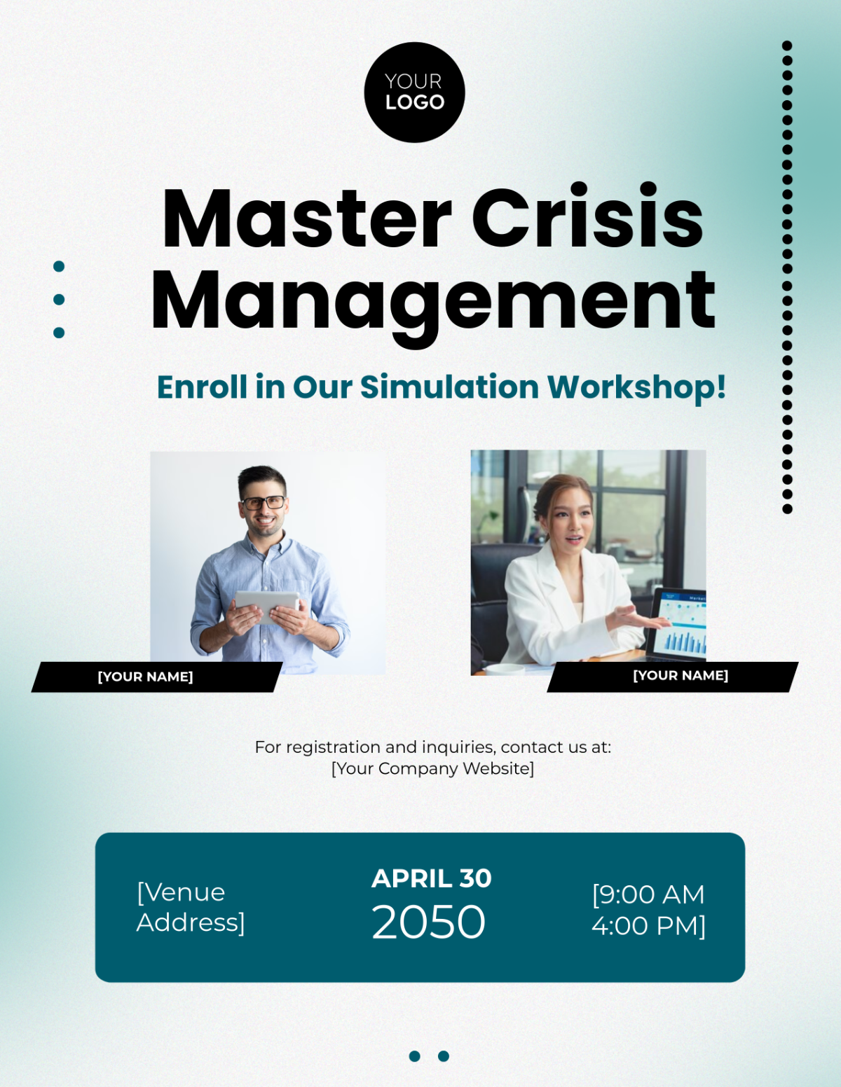 Prepare for the unexpected with the Crisis Management Simulation Workshop Flyer Template from Template.net. Designed for workshops that offer hands-on crisis management training through simulations, this customizable and editable flyer is a powerful tool for attracting leaders and managers. With the capability to edit in our Ai Editor Tool, it's perfectly suited for events that aim to build resilience and preparedness among professionals.