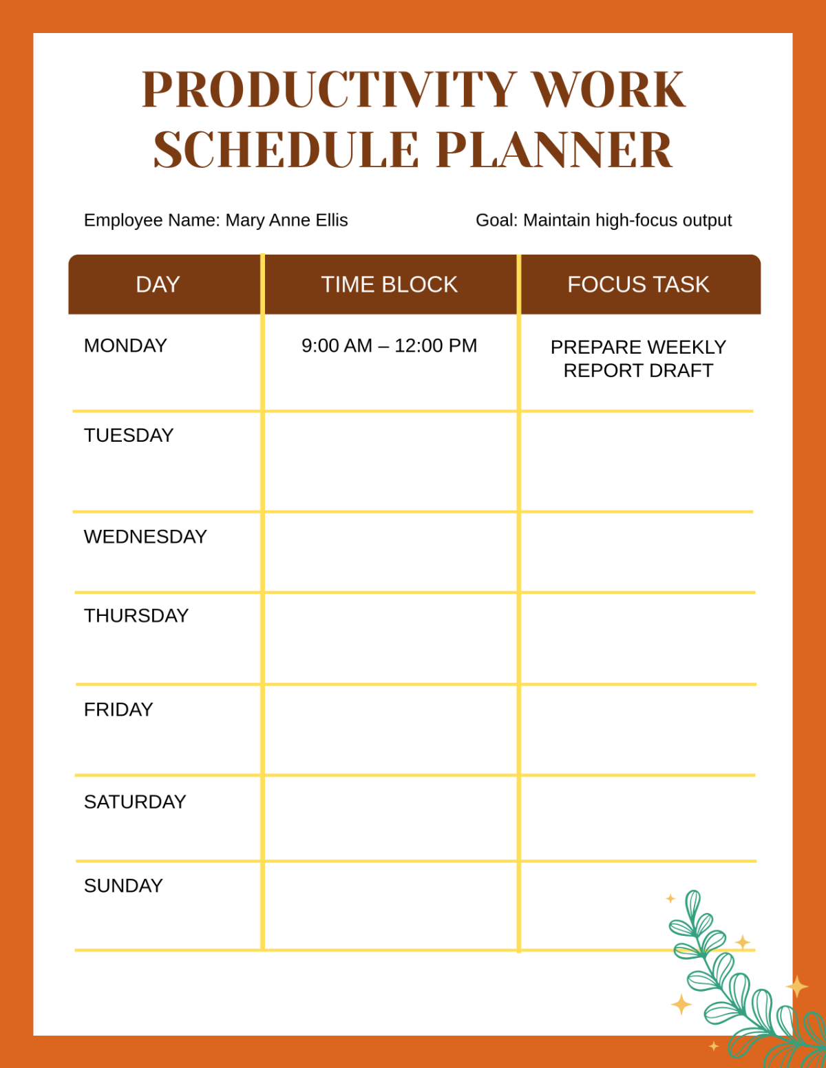 Organize your time effectively with Template.net's Block Schedule Planner Template. Editable in our AI Editor Tool, this customizable template features a clear and structured design, perfect for allocating specific time blocks for tasks, meetings, and activities. Ideal for professionals, students, and anyone seeking better time management, it ensures your schedule is both organized and efficient. Master your time with Template.net!
