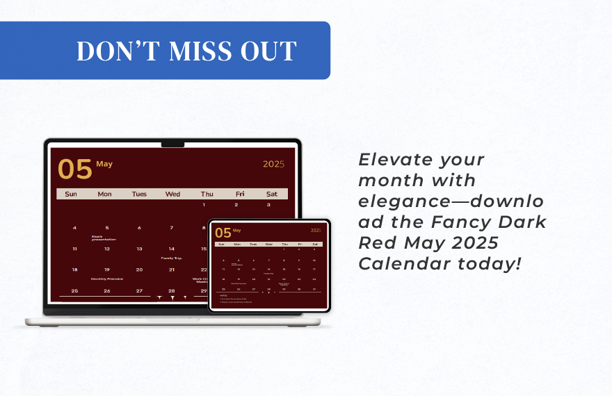 Add a touch of elegance to your monthly planning with this Fancy May 2025 Calendar in a deep, rich dark red theme. Designed for those who appreciate both function and style, it’s fully editable in Word, Google Docs, and other popular formats.