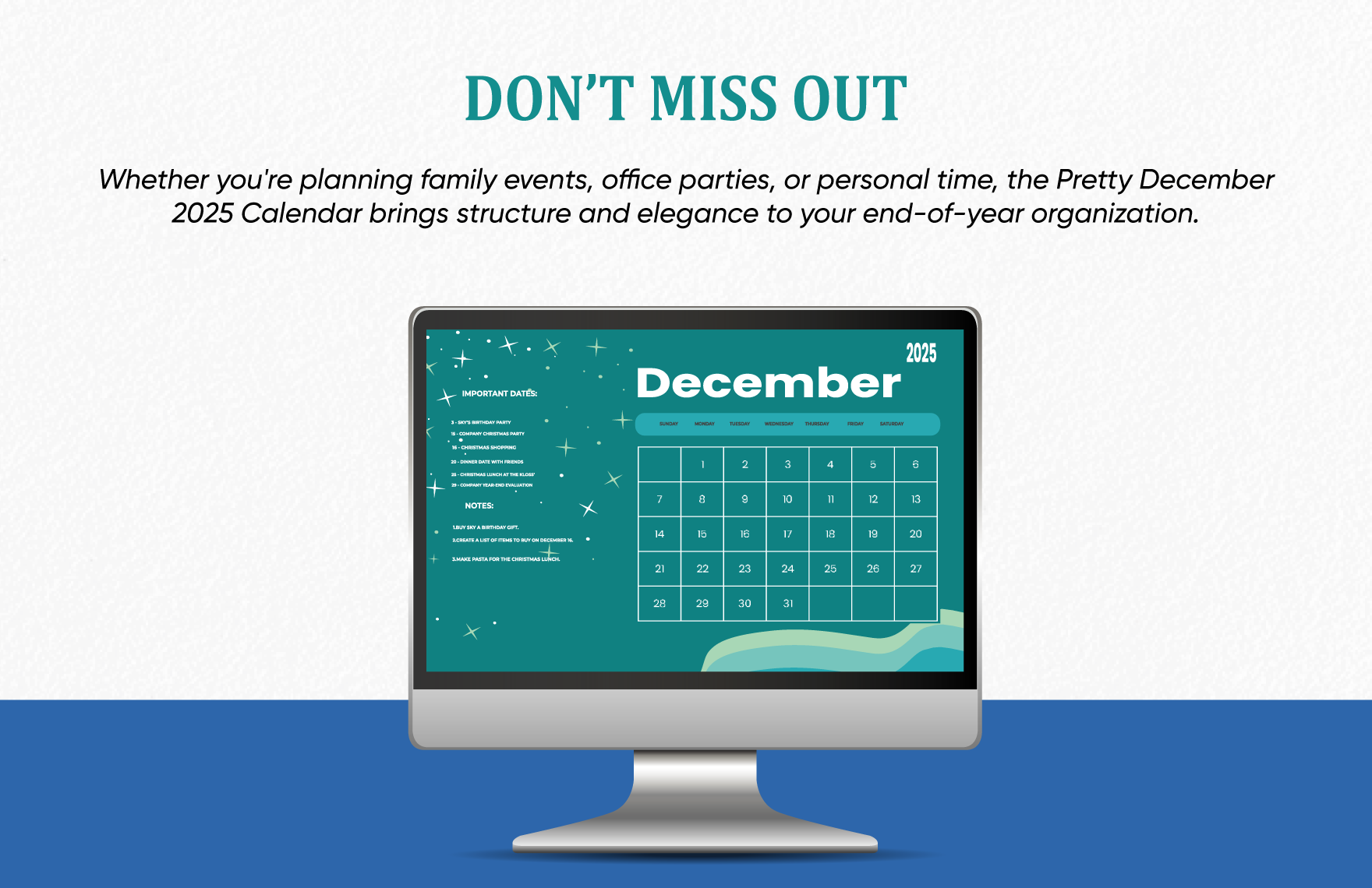 Elevate your holiday planning with the Pretty December 2025 Calendar — a stunning and serene template that brings both charm and clarity to your scheduling. With its starry teal background and soft flowing border, this calendar adds a gentle winter glow to your workspace or planner.